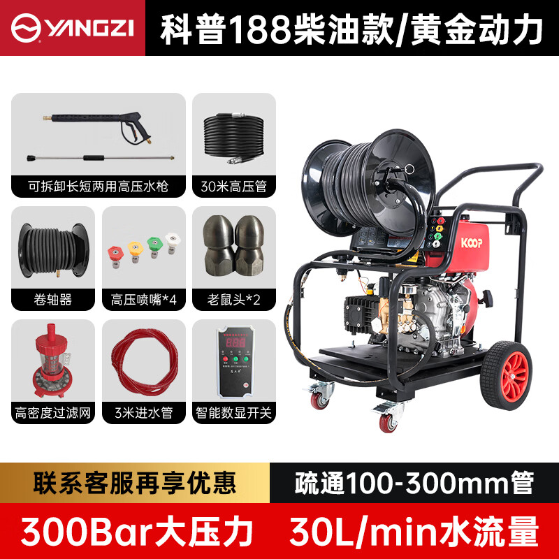 一臺揚(yáng)子YZ-D30-30柴油款管道疏通機(jī),動力強(qiáng)水流大暢通無阻拐彎無壓力。