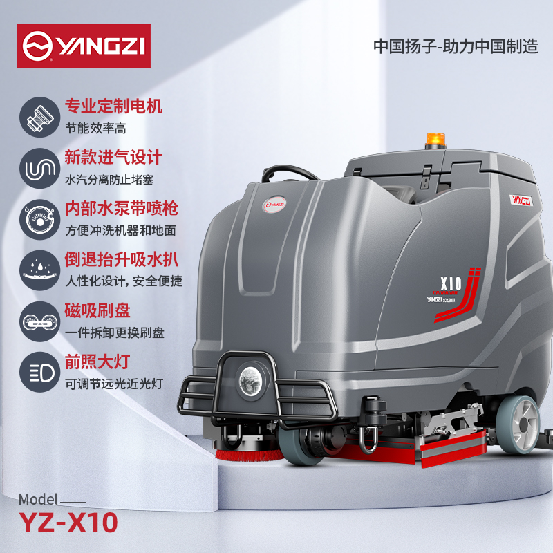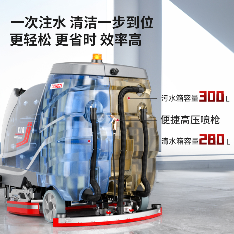 揚子YZ-X10大型駕駛式洗地機(jī),1次充電續(xù)航7-8H,配置高壓水槍清潔頑固污漬,智能集成儀表清潔過程得心應(yīng)手。